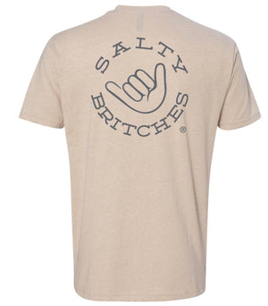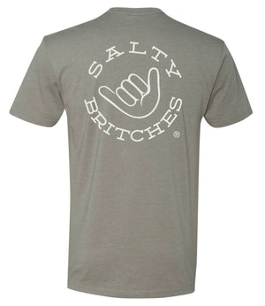 This premium, unisex t-shirt is a soft pre-shrunk blend available in a variety of colors & sizes. The front of the garment features a small "shaka" hand beside the iconic Salty Britches moniker. On the back is a large, circular, surf-style version of our circular hang loose logo.