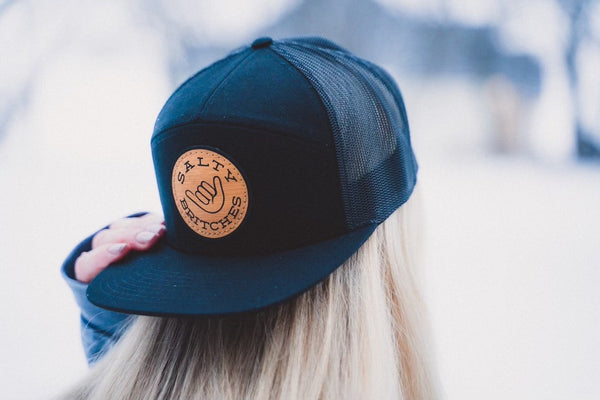 This unique 7 panel trucker cap is designed to create a seamless front panel, perfect for the leather patch Salty Britches logo.