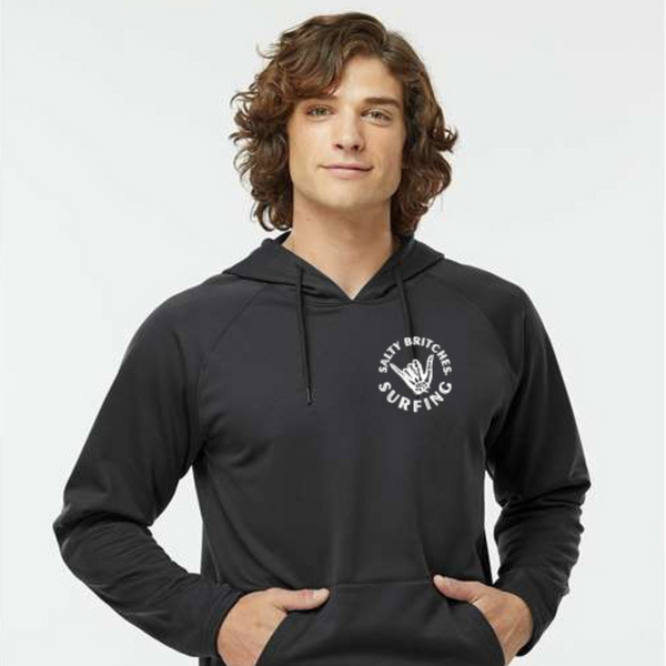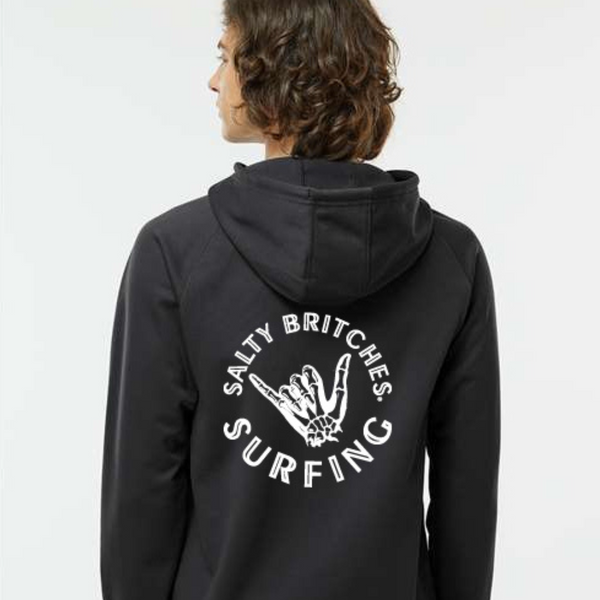 This premium, unisex black hooded sweatshirt is a soft pre-shrunk 100% polyester fleece with Dry Zone moisture wicking technology pullover with front pouch pocket. The front of the garment features a small "shaka" iconic Salty Britches skeleton round logo. On the back is a large, circular, surf-style version of our skeleton hang loose logo.